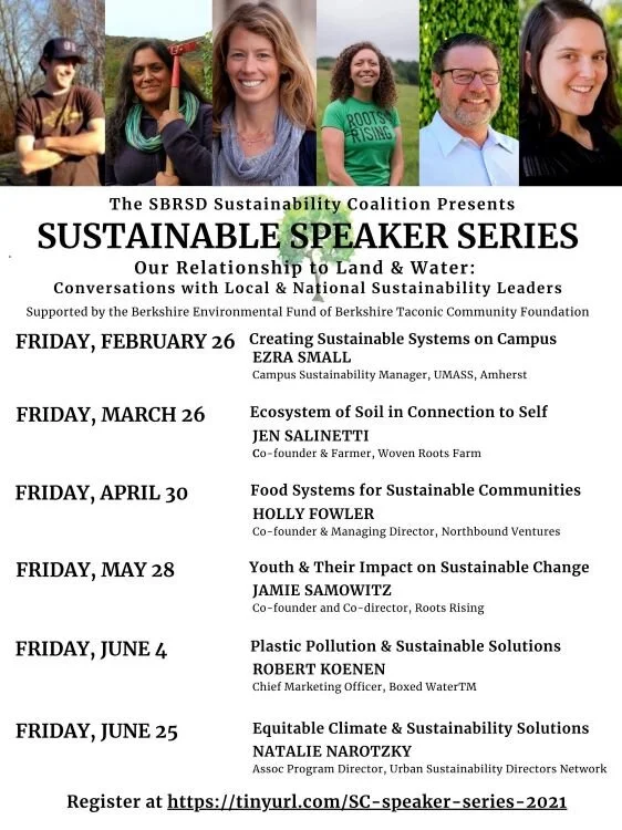 The student-led Sustainability Coalition of the Southern Berkshire Regional School District, supported by a grant from the Berkshire Environmental Endowment Fund of Berkshire Taconic Community Foundation, presents The Sustainable Speaker Series -- Our Relationship to Land and Water: Conversations with Local and National Sustainability Leaders. This virtual speaker series is open to the general public at no charge and will focus on sustainable initiatives in the region and the world. From February through June, our speaker series will present a range of experts to offer actionable methods for audience members to affect change in their households and communities. Speakers will share their experience and research on various topics within the overall focus of environmental sustainability will present a complimentary virtual speaker series featuring six influential leaders in various sustainability fields to inspire action and raise awareness to build a better future for this generation and generations to come.