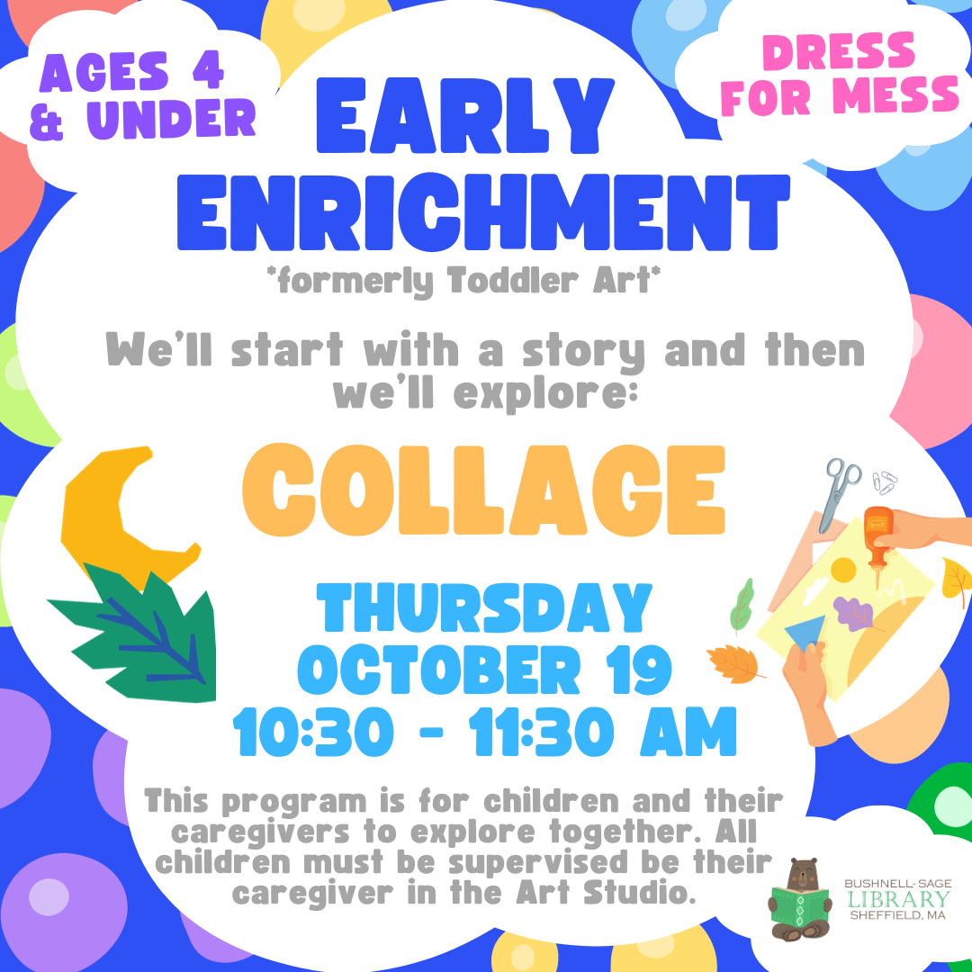 Join us on Thursday, October 19, any time from 10:30 - 11:30 AM to explore Collage! Explore tearing, cutting, and gluing paper and other materials to create collage.