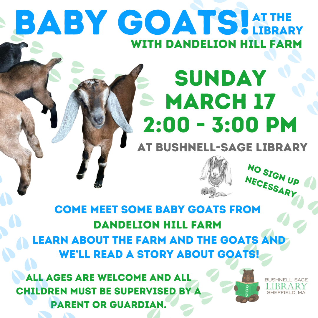 Dandelion Hill Farm has generously offered to bring some springy, sproingy baby goats to the library for you to meet and greet! You’ll learn about the farm, which is right here in Sheffield! You’ll learn about goats! We’ll read a goat-themed story. But let’s be honest here; this is about the baby goats! If you love baby goats or haven’t yet experienced the delight of being in the presence of baby goats, stop by!